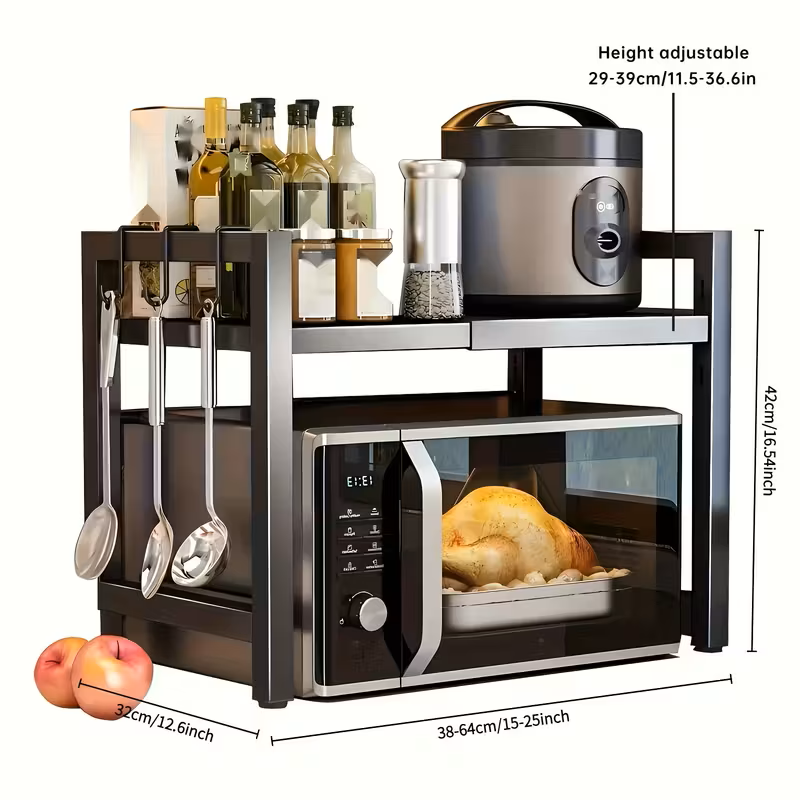 timize seu espaço com esta estante multiuso de cozinha, projetada para unir organização, praticidade e design contemporâneo. Com estrutura metálica resistente e acabamento elegante, ela oferece dois níveis de armazenamento e ganchos laterais para utensílios, tornando-se uma solução completa para ambientes compactos ou gourmet.