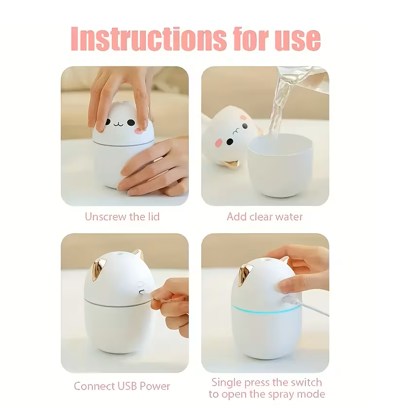 Transforme seu ambiente com este umidificador ultrassônico que une funcionalidade e charme. Com design inspirado em gatos, ele apresenta um corpo branco brilhante e orelhas metálicas rose gold, além de um rosto simpático com bochechas rosadas. Ideal para quem busca bem-estar com estilo.